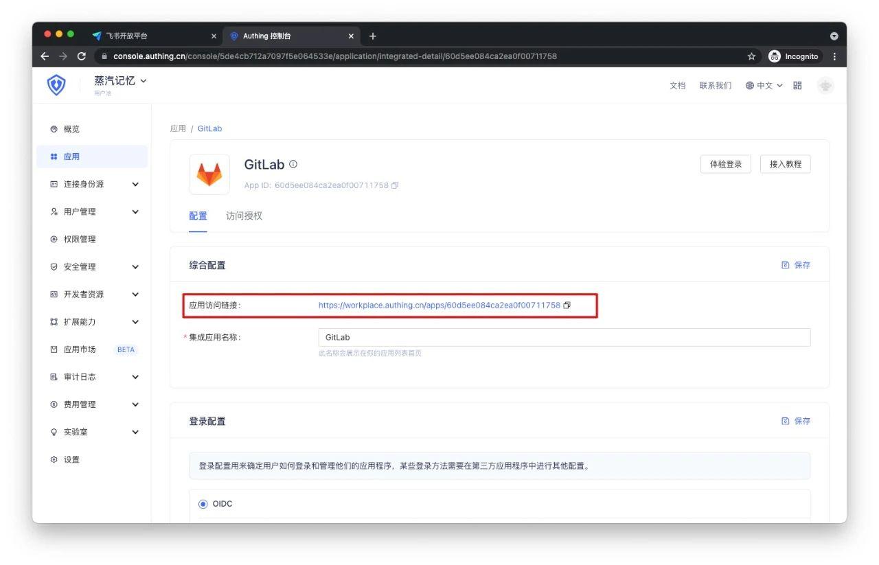 2. 进入 Authing 控制台 - 应用列表,进入 GitLab 详情页,复制「应用访问链接」