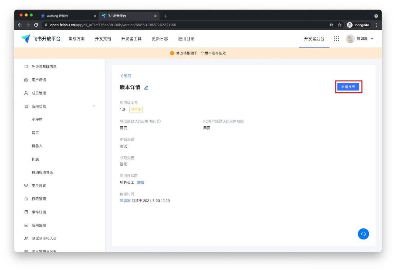 4. 进入飞书开放平台「版本管理与发布」,点击「创建版本」,填写详情后点击「申请发布」