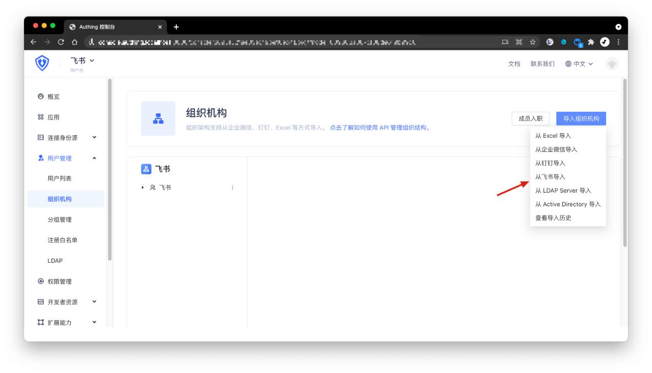 在 Authing 控制台用户管理 - 组织架构页面点击右上角 - 导入组织机构 - 从飞书导入。此后,飞书的增删减改操作将实时同步到控制台的组织机构变动。