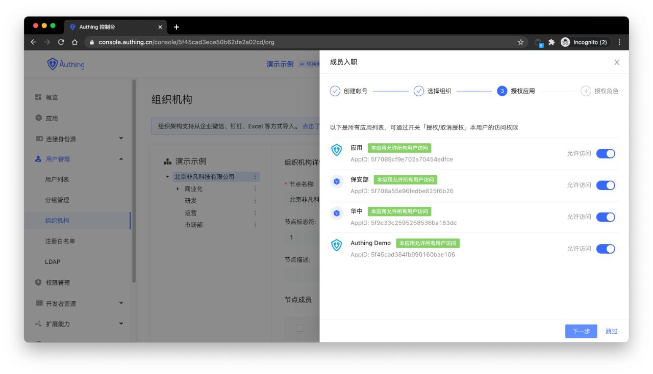 2. 授权该员工能够访问的应用
