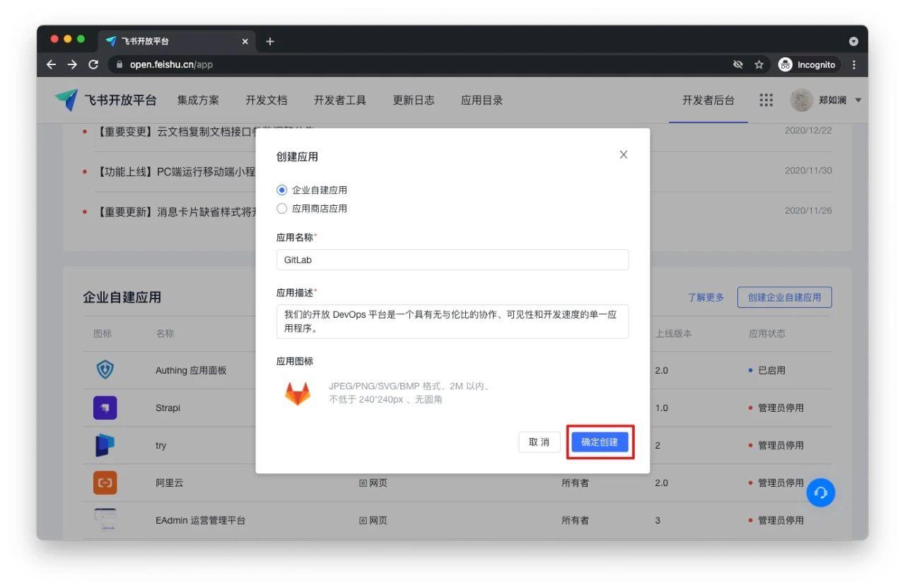 1. 进入飞书开放平台,点击创建 GitLab