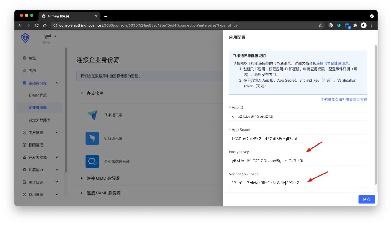 事件订阅的 Encrypt Key(可选),如果你不需要和飞书组织机构保持实时同步,可以不填写;